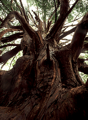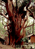 道は山に近付くにつれてだんだんと狭くなり日が暮れないうちに先を急ぎたいと思っていたのですが、スピードをだすどころか、路肩から谷に落ちないよう慎重に運転しなくてはならず、村に付いたころはすっかり夕方になっていました。薄暗くなった山道を走っていると本当に恐ろしく何か物の怪が憑いてきそうな気がして、怖くて怖くてしょうがありませんでした。しかも薄暗くなった中でこの樹は墓地にあったため、僕はそれ以上そこに立っていることができず、翌日出直すことにしました。 次の日おっかなびっくり出かけていったのですが、昨日程は怖く無いにしても、やっぱりちょっと怖く慣れるまでしばらく木の下で座っていなければなりませんでした。 もう何本の巨樹に出会ったか数えきれませんが、出会った瞬間はこの樹の時ほどでは無いにしてもいつも怖くて仕方がありません。しかし、この最初に出会ったときの怖いという気持ちは、実は大変大事なことじゃないかと思っています。樹を見た経験がたとえなくても、森や大きな木を怖いという記憶を僕たちは持っているような気がするのです。 |