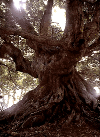 数年前にこの木を撮影したとき、お寺の子供だと思うんだけど、姉妹が木の下で遊んでいるんです。3才か4才ぐらいかなあ。一緒に連れていったうちの子の方が少し大きかったんで、「お兄ちゃん、お兄ちゃん」ってなついて、かわいくってねえ。うちの子と違って彼女達は毎日、あの木の下で育ってるんですよ。最近、身近に深い森があるとか、大きな巨木があるとかそういった自然のすごさが感じら れるものって都会からは減ってるでしょう。だから毎日こんな大きな木の下を歩いている子って今ごろどんなになっているかなって、よく思い出すんですよ。 僕は、この称名寺の椎が好きで、なぜかというと巨樹ってよくよく見ると人間ぽく見えるところがあるんですよ。「この木は青年期で伸び盛りだ」とか、「こいつはちょっと俗っぽい」とかね(笑)。巨木になるとなおさらなんだけれど性格がよく現れている木が多いんです。称名寺の椎は結構“元気なオヤジ”で、なんか「やったるぜい!」みたいな感じがするんだなあ。 いつも思うんだけど写真を撮っているときに、なんか撮りきれないというかいろんな角度で撮影しても、木にいろんな表情がありすぎて撮っても撮ってもまだまだ木が違った表情を見せてくれる木は僕は好きなんですよ。 ちょっと違うかもしれないけど優れたアートって多面性があるでしょう。たとえばモナリザだって、若い女だと言う人もいれば結構歳をとっているという人もいる。泣いているようでもあるし、喜びをこらえているようでもある。 そして、そんないろんな表情を持つ木を見て育つ子供は、いったいこの木のいくつの表情を見て大きくなるのかなあ。 |