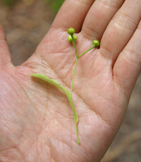 | Qこれは何でか A プロペラのようにくるくる回って落ちる種になります。シナノキ科のナツボダイジュの花序です。この植物園にはシナノキ、ヘラノキ、ボダイジュ、ナツボダイジュなどシナノキ属のものが集められて植えられています。 |
