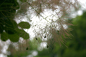 | Qこの不思議な花はなんだか判りますか A ウルシ科のハグマノキといいます。ケムリノキ、カスミノキ、スモークツリーとも呼ばれています。ハグマノキという和名は「白熊(はぐま=やくの尾の白い毛)」で作る払子(僧侶が手にもつ仏具の一つ)に見立てたことによるそうです。ヨーロッパ南部〜ヒマラヤ、中国中部の原産だそうです。ドライフラワーとしても使われます。 |