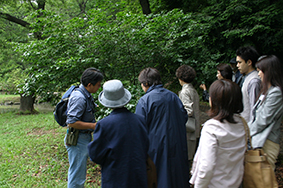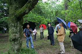 | あいにく、小雨まじりの天候で、しかも5月下旬とは思えない寒さでした。 しかし、普段はなかなか植物園をゆっくり歩いたり、植物の話を聞くという機会はありません。あちこちで「へー」とか「そうなんだ」という感嘆の声が漏れていました。参加者は総勢14名。初めての方は半分ぐらいいらっしゃり楽しい一時でした。 「すぐ忘れてしまうんですよね」といいう声に「5つ話をきいて、1つ憶えていればいいんですよ」と染野さんはいいます。もっとも、僕の場合はもう少し打率が悪く20ぐらい聞いて、1つぐらい憶えているのが関の山です。 忘れっぽい皆さんと僕のために、何とか覚えているネタを今回から豆知識として公開しまう。 |