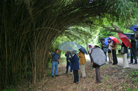 | Q笹と竹はどこが違うのですか A よく背の低いのがササで、高いのがタケと思われているようですが、そうではなく筍から生長したとき、竹の皮(稈鞘といいます)がいつまでも付いているのがササで剥がれ落ちてしまうのがタケです。 (しかし、ナリヒラダケのようにしつこくぶら下がっているものもあります) 写真のものは九州の南部や琉球地方に野生しているといわれるタイミンチクです。大型ですが、ササの仲間です。 |