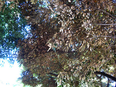 葉っぱの裏だけを見ると、なんだか火にあぶられて枯れているように見えます。でもこれで正常。スタジイの葉の裏はこのように茶色いです。乾いた所が好きで、ドングリができます。
