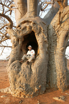 アフリカのツアーは2回目になります。タンザニアとケニアを含めたのは初めてで、それなりに実りある旅でした。 ハプニングを話すと、南アフリカのメッシーナのホテルに着いた時、ホテルのフロントの女性がビックトゥリーはカミナリでやられりしまい、無くなってしまったのでいかないようにといわれたことです。彼女は跡形も無く片づけてしまってなくなってしまったというのです。困りました。僕たちの今回の旅のメインの目的が、世界最大級のこのバオバブを見に行くことだったからです。彼女はホテルの敷地にあるバオバブを見に行くようにさかんにいうので、参加者の皆さんと相談しました。ある人は敷地内のバオバブを見に行くといい、ある人は跡地でもいいからビックトゥリーを見に行くといいました。道も決してよくないので、バスの運転手もあまりいきたくなさそうです。相談の結果、道が悪くても行こうということになりました。跡だけでも良いということにしたのです。もう、樹は無くなってしまっているのだからと、途中のバオバブをゆっくり見ながら行ったのですが、なんとバオバブは何ともなくあったのです。どうしてか分かりませんが、フロントは僕たちをだましていたわけです。 |