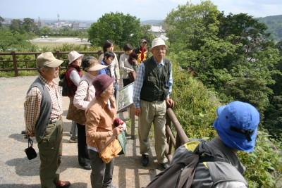| 栢野の大杉を前に記念写真です | 金沢城のなかの植物群の話をする濱野さん | ||||||||||||||