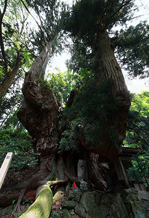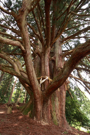 岩屋の大杉。幹は5本ですが昔は12本あったそうです。なんか力こぶをつくってたっているような木です。下には小さな祠がありました。
