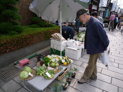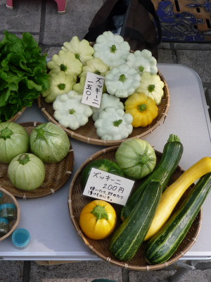 大野市ではわずかな時間だったのですが、朝市を楽しみました。飛騨高山でも朝市には行ったのですが,高山の朝市がちょっと観光よりなのに対して、大野の朝市は地元の人のためにやっているような、のんびりとした風情があります。朝のみそ汁の菜っ葉を買いにくるようなそんな感じです。ちょっと、かわったズッキーニを発見。ヒゲ爺は早速購入していました。