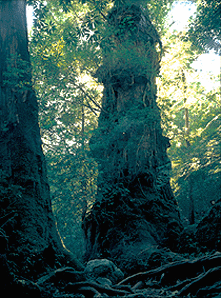 隆々とした筋肉。ときに力コブさえも見せる何千年のいのち。自分より大きなもの、はるかに偉大なものに対する動物的本能のなせるわざだろうか。歩みよっていくと最初に恐れがやってくる。だが不思議なことに、その気持ちに耐えて木のそばにいると離れがたくなる。母なるものに抱かれているようなやすらかさ。そういう具合で、ぼくはいつも千年の森の杉の前で長い時間を過ごす。 しかし、ぼくはこの森でかれら以外の木にも魅了された。滑らかな木肌を誘惑的にしならせたヒメシャラ。天に向かって巻いていくかのように立つハリギリ。杉やツガ、モミなどの巨木に抱きついて太くなったヤマグルマ。生きている木だけでなく、土埋木と呼ばれる杉の切り株や倒木とそれらにびっしりとついた無数のコケ。これらのいのちの勢いに圧倒されたのだ。 |