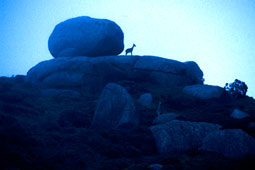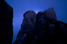 | 千年の森をぬけ、高度を上げていくと、白骨樹と呼ばれる樹皮を剥がれ立ち枯れたような杉とシャクナゲに囲まれる。さらにそこから上は森林限界。笹原にぬける。山々の山頂部が見わたせる、そこには奇妙な形をしたさまざまな巨岩が乗っている。さえぎる木がなく、直接吹く風と雨によって浸食された岩。島の自然が一〇〇〇万年前の堆積層を風化させ、このユニークな山頂世界をつくったのである。 | |