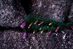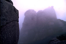 | たれているロープにつかまりながらカメラをかかえてこの巨岩になんとか登った。そうしてリンドウの花を撮ろうとセッティングしていると、ものすごい雨が突然降り出した。岩の上には隠れ場所などあろうはずもなく、ただ雨が止むまでずぶ濡れになりながらカメラだけを自分の体でおおった。三〇分以上もたっただろうか。雨がやむと今度は強風がきた。風速はおそらく二〇メートル近い。さんざんな目に会ったが、こういう自然が巨岩のモニュメントを生んだ偉大なる彫刻家であることがわかった。 |