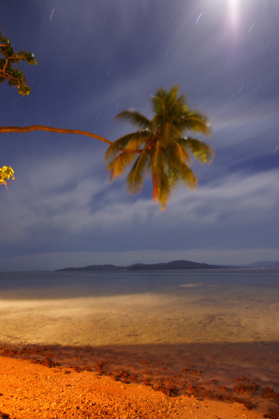 フィジーのタベウニ島という素敵な島での一コマ。夜、トーチに照らされている、ビーチと夜空です。 |