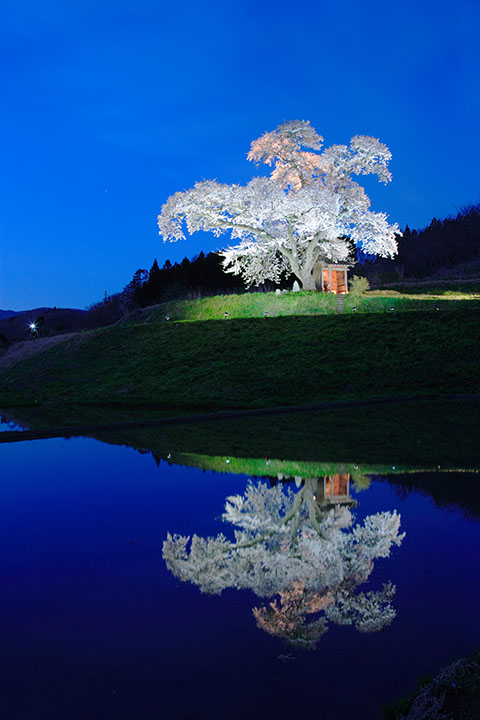 2008年4月初旬から6月上旬福島県古殿町「越代の桜」 ライトアップが始まった時間をねらって撮影しました。 |