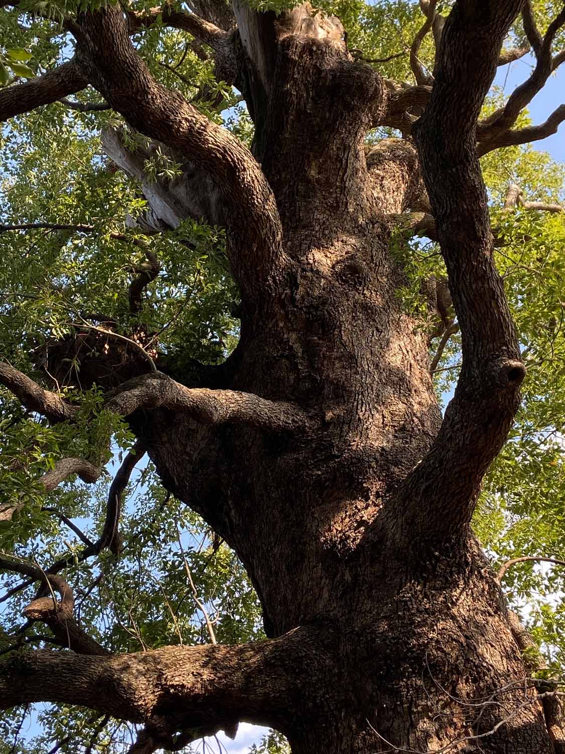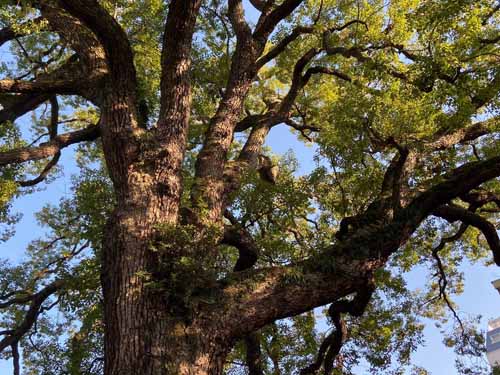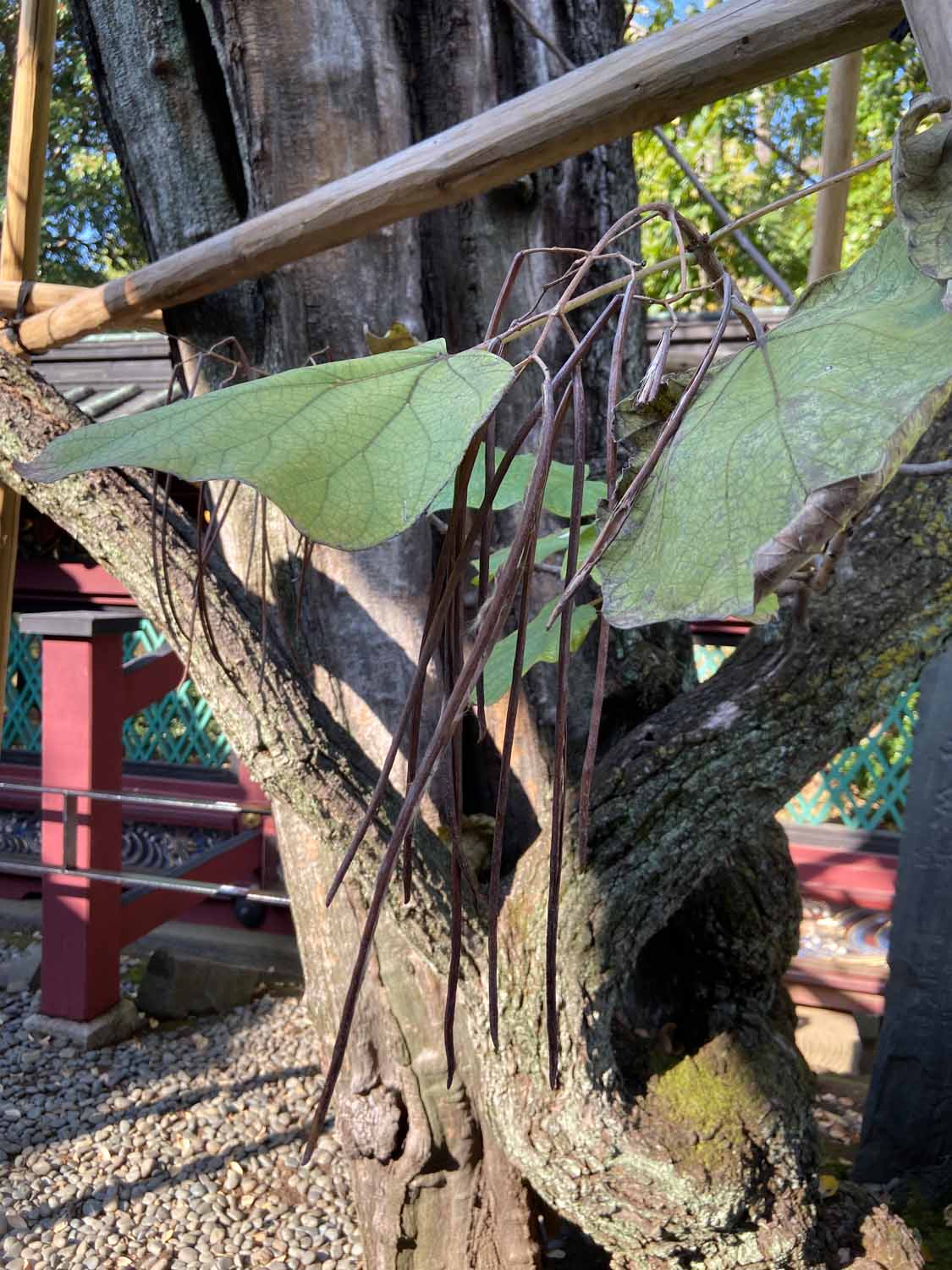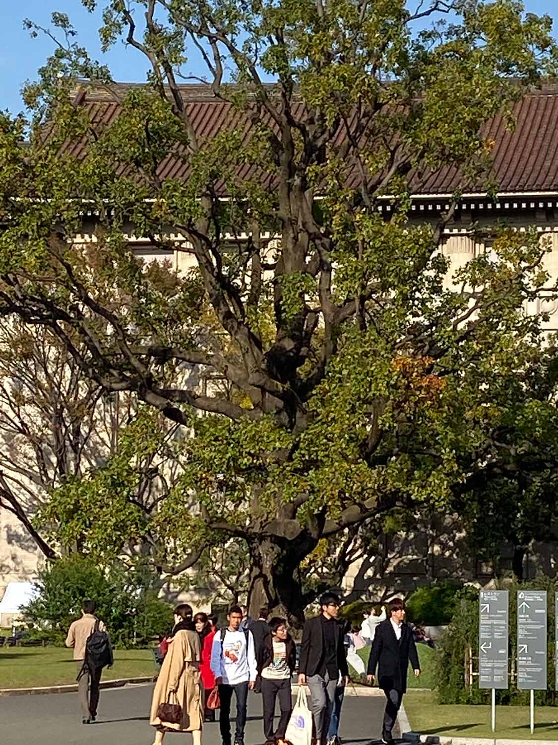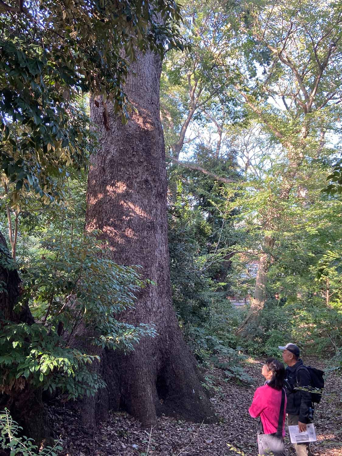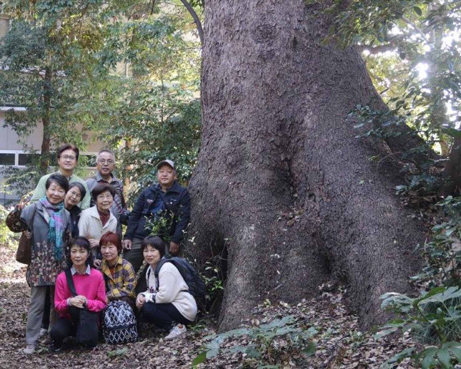 その後は上野公園を横断する形で東京芸大の構内へ。ここで最初に見たのはスタジイのかなりの老木。こんなになっても生きているのかと思われるほど、幹の一部しか残っていないのに、立派に葉っぱをつけていて生命力に感動しました。すぐ裏にはこの日最大のクスノキの巨樹がありました。芸大の中にはいろんな種類の木がたくさん植えられていると聞きました。