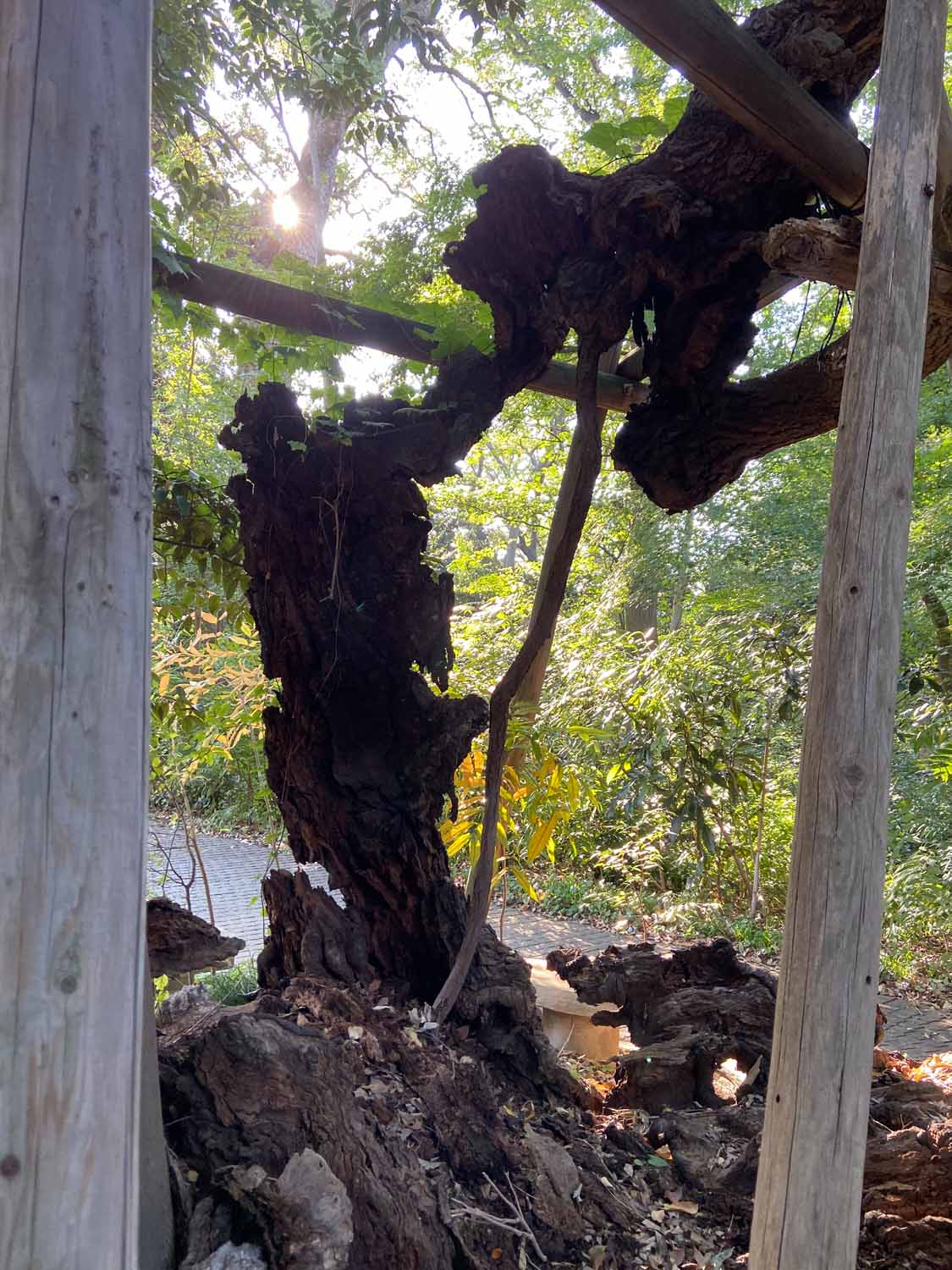 千駄木では、江戸時代の大給藩松平家の屋敷内にあったイチョウを見学。いまは子供たちが集う小さな公園になっているため、とても刈り込まれていてちょっとかわいそうでした。途中、旧森鴎外邸の庭を眺めて最後は、栄松院のスタジイへ。この木は東京大空襲で被弾しほとんど部分がなくなっていました。それでも一部から細い新しい幹が生えて、たくさんの緑をつけていました。木は動けないからトラブルも甘んじて受けなくてはなりませんが、それでも黙々として生を続けようとする。木はその存在そのもので、人間の私たちに多くを教えてくれているような気がしました。