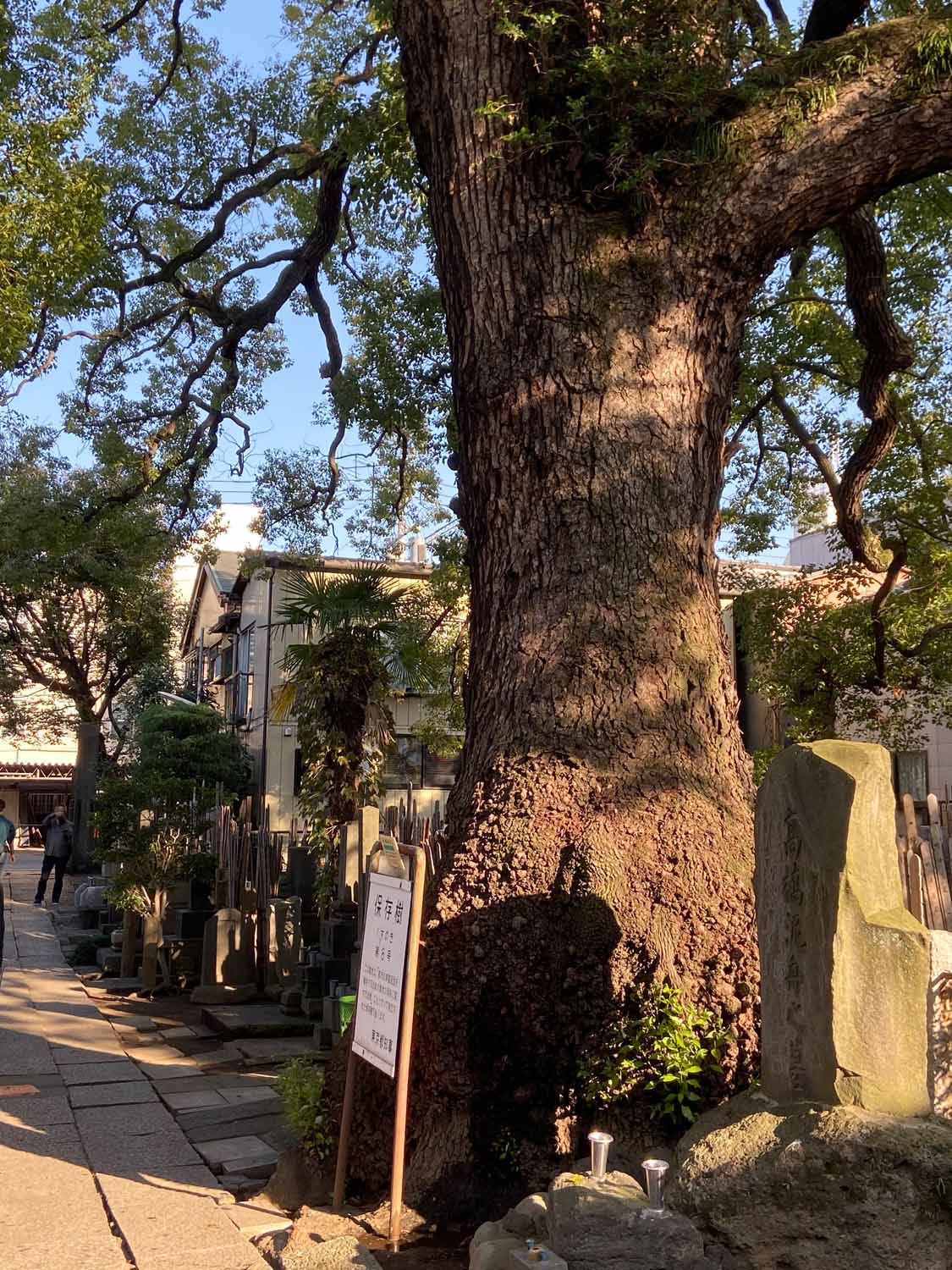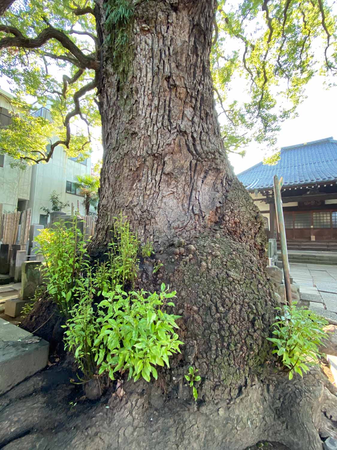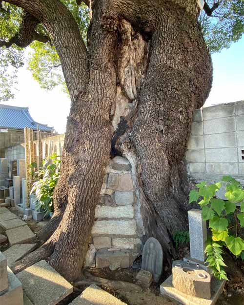 そして、谷中で有名なみかどパン店さんのヒマラヤスギへ。残念ながら台風19号で大きな枝が折れてしまっていました。谷中からは千駄木を目指しながらお寺を巡って、クスノキの大木を何本か訪ねました。大雄寺のクスノキは野生的で、妙雲寺と感應寺の境に立つ塀を飲み込んだクスノキはとても迫力がありました。