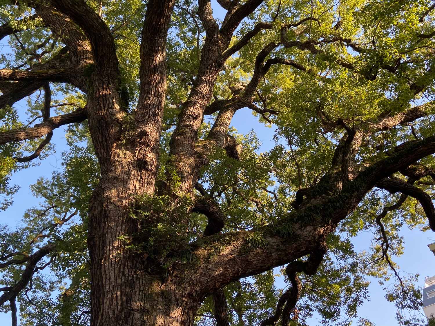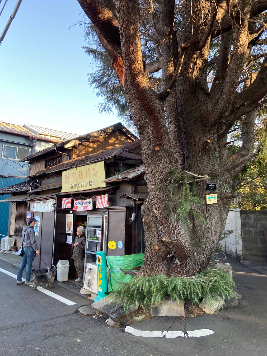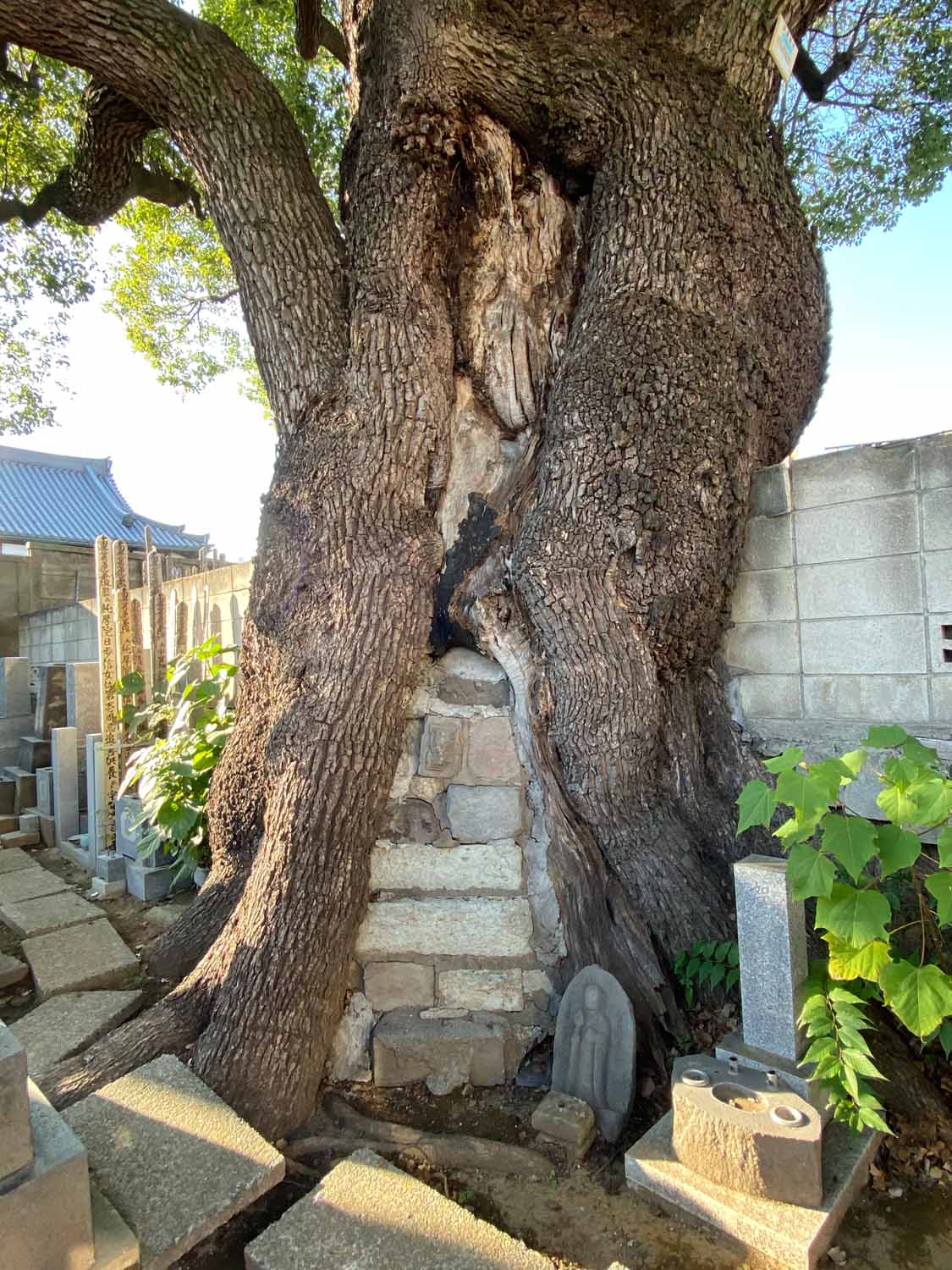 そして、谷中で有名なみかどパン店さんのヒマラヤスギへ。残念ながら台風19号で大きな枝が折れてしまっていました。谷中からは千駄木を目指しながらお寺を巡って、クスノキの大木を何本か訪ねました。大雄寺のクスノキは野生的で、妙雲寺と感應寺の境に立つ塀を飲み込んだクスノキはとても迫力がありました。