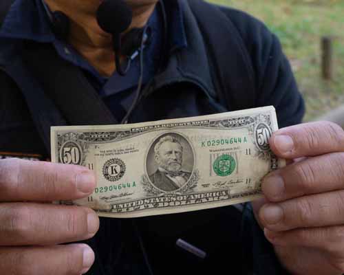 最初に行ったのがアメリカ紙幣の50ドル札になっているグラント将軍お手植えのローソン檜。明治10年から13年にかけて世界を周遊中に立ち寄って植えたのがこの木です。明治12年に植えられたものなので140年は経っています。かなり弱って見えるのは日本の風土にあまり合わなかったためではないかと……。アメリカ西海岸の原産だそうです。植樹の際には大歓迎会が模様されたそうで、隣には夫人が植えた泰山木がありました。こちらは見事に育っていてました。