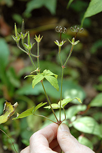 ゲンノショウコは夏ごろ小さな可愛いらしい花を咲かせますが 写真は果実の状態です。 果実が熟すと下から跳ね上がれ中の種を飛ばします。 この果実が跳ね上がった状態が祭りで使う神輿に見立ててミコシグサという異名もあります。 写真では右のものが跳ね上がった状態、左のものがまだ跳ね上がる前の状態の果実です。 和名の由来は「現の証拠」、下痢止めの薬として飲むとすぐ効果があるのでこのような和名がついています。 |