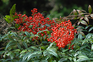 ナンテンは写真のように赤くて綺麗な果実がなり丈夫な低木なので庭木としてよく植えられるます。 また「難を転ずる」ということで縁起木としても好まれます。 果実を乾燥させたものは咳止めの薬になるそうです。 (南天のど飴などありますよね) 葉は強壮剤になるそうです。撮影された写真は近くの民家に植栽されていたものでしょう。 |