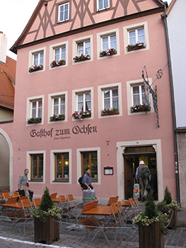 ちょっとづつ、のんでみたかったからです。ただ、僕の感想としては、最初のひと口ふた口はわかったのですが、だんだんどうでもよくなってしまい、種類より量がほしくなりました。日本のおやじはしょうがないですね。最終的には新橋のガード下で飲んでるのと変わりません。情緒ないなあ!! しかし、一日目は移動日です。はるばる成田からドイツに到着し、バスでローテンブルグまできたので、食事をすませて、そうそうそうに休みました。 |