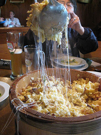イチイの樹を訪ねる前に、山小屋で昼食をとりました。そこで食べたのが、名物のケーゼスペッツ。パスタチーズ焼きとでもいうのでしょうか。パッと見た目納豆でも入っているように見えますが、これはチーズです。これがご覧のように桶に入ってくるのですが、食べても食べても減らない、魔法の代物で、最後は大野さんと塀内さんに頼るしかないといった状況でした。でも、とても美味しかったですよ。