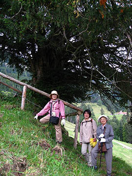 今回の旅行の中では思い出深い日になりました。それは、少しばかりトレッキングしたからです。お目当てのイチイの樹まで、ゆっくりゆっくり歩いて1時間ほどでしょうか。足の悪い家の母は、老川さんや飯森さんの奥さんに励まされ、行ける所までといいつつ、村上さんの杖をお借りしながら、とうとう最後まで行き着くことができました。うれしかったみたいです。