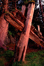 1974年、ハイダ族は環境保護を唱えるカナダ人とともに森を守るために立ち上がった。10年以上のカナダ政府との闘争の末、クイーンシャーロット諸島の南側グアイ・ハアナス(輝く土地)と名づけられ、国定公園に指定される。 |