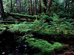 | そう、そこで人生が終わっても何の悔いも無いと思える場所なのだ。レッドシーダー、イエローシーダー、スプルース、島は一様に針葉樹の巨樹にあふれている。コケで覆われた地表は、どこに座ってもやわらかく、テントを張って横になると、大地のやさしさが体に染みわたる。 |