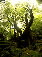 | それと、もうひとつ。最後に訪ねたい森の存在があったせいだろう。 千年以上の寿命をもつ杉が何本もあり、日本でいちばん古い木が生きている森。ぼくはその森を勝手に「千年の森」と名づけ、頭の中に幻想的な姿を描いていた。 その森はおそらく、ぼくが感じ取ってきた森の効用を最大限に持ち合わせている。だから最後までとっておきたい。行きたいのを我慢して、いろいろな森へ行ったあとでゆっくりと味わいたい。そんな森だった。 ほかの森から戻るたび、千年の森へのあこがれは強くなった。行かないことで、森はどんどん頭の中で理想化され、あげくのはてに千年の森のある島は無人島の像まで結んだ。 あこがれが高みを増すほどに、早く行きたいという願いも強くなった。 |