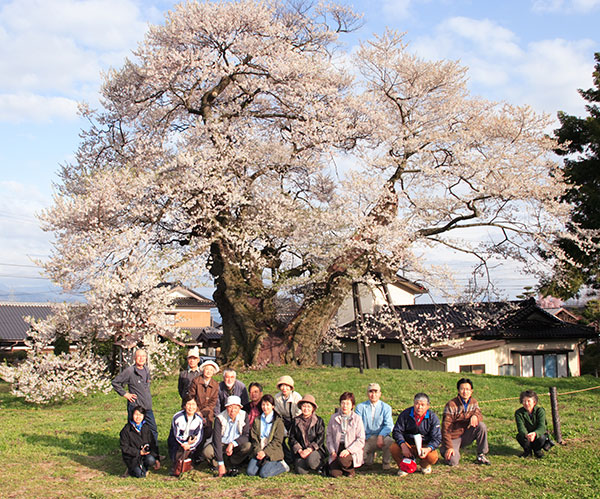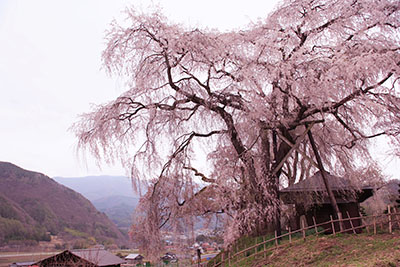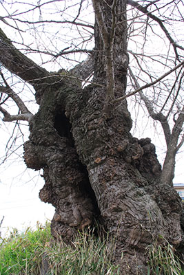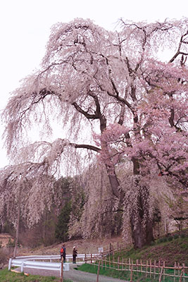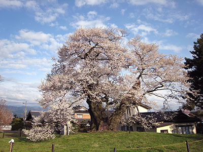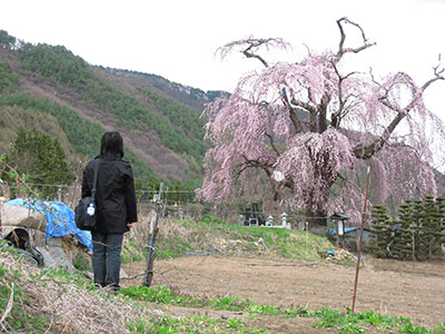 久保の枝垂れ桜 和田村指定天然記念物 樹高約20m 目通り4m 推定樹齢400年 ほとんど知られていない枝垂れ桜ですが、ネットで調べて、咲いているということで出かけました。上の方は折れていましたが、多分雪の影響ではないかということでした。それでも中々、見事な枝ぶりで、見ごたえのある木でした。 |