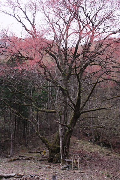 | 内の萱のカツラ 伊那市 幹周り9.2m 樹高30m 樹齢300年以上 カツラは水が好きな木なので、この木も川の近くでたたずんでいました。 近づいていくと枝に真っ赤な葉っぱが付いていると思ったのですが、染野さんに伺ったら、花だということです。 カツラは何度も見ているのですが、花を見るのは初めてで、たても気持の良い思いでした。 この木を訪ねたのは3日目で、この下でお弁当を食べたので、良い思い出になりました。 この赤い花に関する詳しいお話を染野さんに伺いました。 |