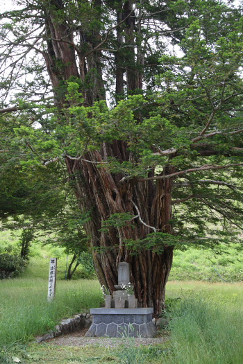 2日目の最初は治郎兵衛のイチイ。1991年の環境省の調査で日本で一番おおきいことがわかったイチイです。このへんでは一位一刀彫と看板を掲げるお店をたくさん見るので,イチイの木はたくさんあったのかもしれませんね。この木は上にいくほど幹が太くなっているのですが、正面から見るとわかりませんが,横から見るとかなり斜めに傾いています。この木の周りに、植えたもんだと思いますが,たくさん花が咲いていてとてもきれいでした。