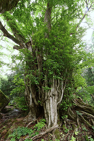 打波の大カツラ。白山神社の境内にあります。幹には多くのこけやシダをつけて風格のある木です。