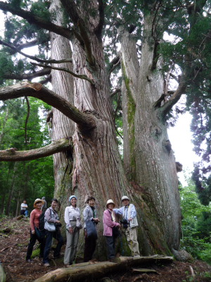 白山中居神社の杉樹群はとても見事なものでした。われわれは、ここでお弁当を食べました。ここの本殿から山道を15分ほどあがったところに「浄安杉」があります。幹周り12m。推定樹齢1200年。見事な杉で僕は初めてだったのですが、形がいいのでとても感銘を受けました。記念写真用に大きな木をきって,前においてくれていて,心くばりにも感謝です。