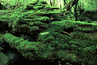 千年の森の杉はほかで見るよりはるかに枝の数が少ない。毎年のように襲ってくる台風のせいで折られたこともあるが、多くの葉をつけないことで必要とするエネルギー量を減少させる。少ない養分のため、自らは節制し清貧に生きながら、着生した木々を養っているのである。ある木は可憐な花をつけ、ある木は実をつける。紅葉する木もあり、着生木は杉に豊かな彩りを添えている。マザー・ツリーのような一本の杉の上はまた、ひとつの森だ。暗い杉の森の林床では発芽しにくい木々たちは、日のあたる高い場所に住まいを得て、いのちをつなぐ。この生存方法に一役かっているのが、千年の森に降る多くの雨である。 ぼくは雨の中に立ちながら、木上の森を歩いているのを想像した。コケが土の代わりとなり、杉が母なる大地となった森。その森には共に生きるというルールがある。 |